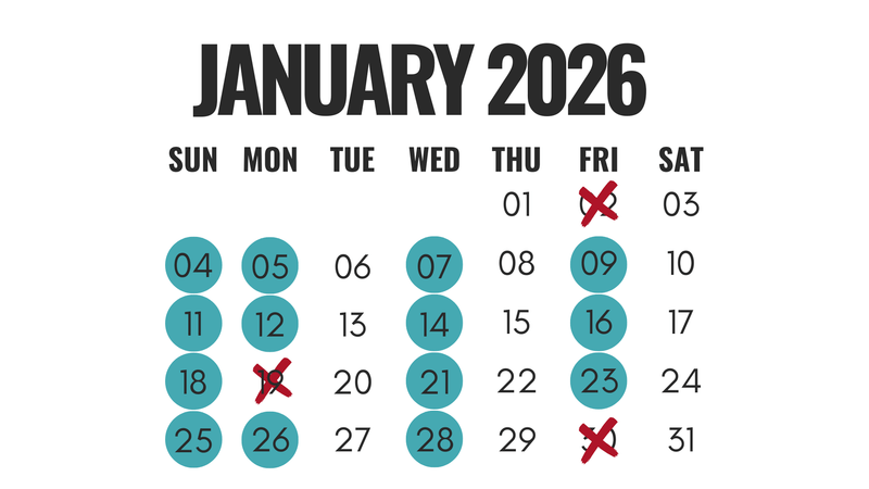 No Class Jan 19, Jan 30, Feb 8, Feb 15-Feb 16, Apr 1, Apr 3, Apr 5, May 8, May 22 & May 24-May 25